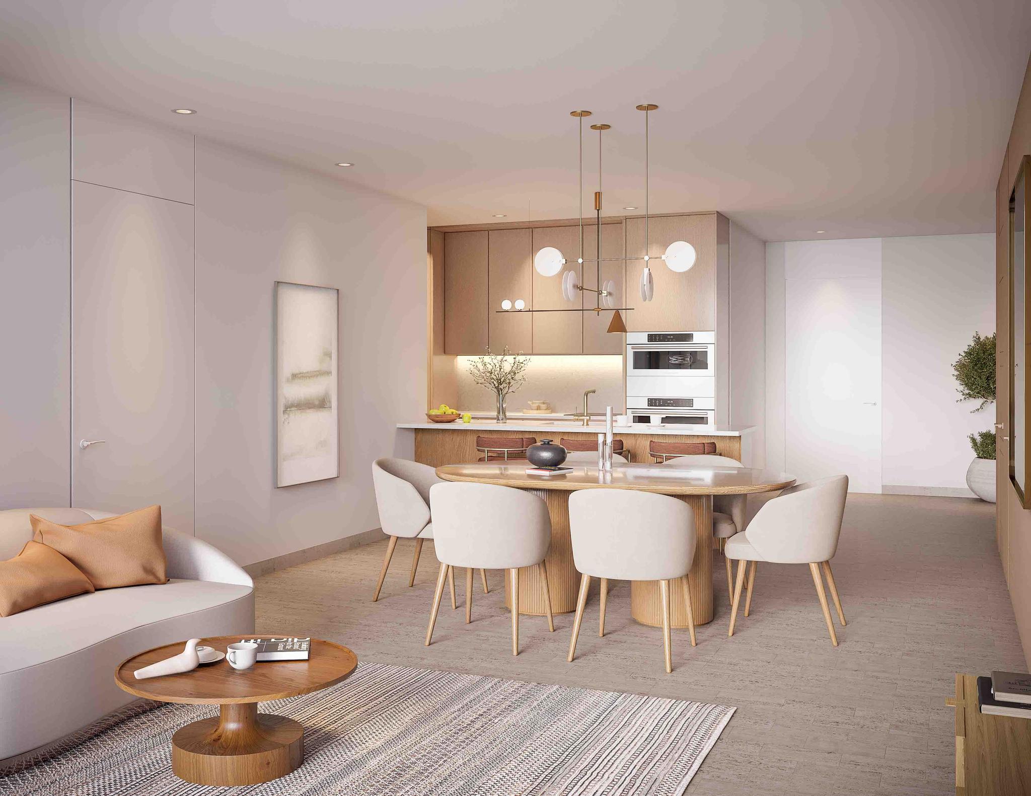 Residents will enjoy over 40,000 square feet of private amenities, including a lush tropical pool deck, curated social lounges, and immersive wellness facilities. The seventh-floor pool deck offers panoramic skyline views, a signature restaurant and bar, a state-of-the-art fitness center, yoga and meditation gardens, a Pilates studio, a pickleball court, and a spa with steam rooms and saunas. Additional features encompass a business center with co-working spaces, a children's playroom, a virtual golf simulator, and a communal vegetable garden designed by Naturalficial.